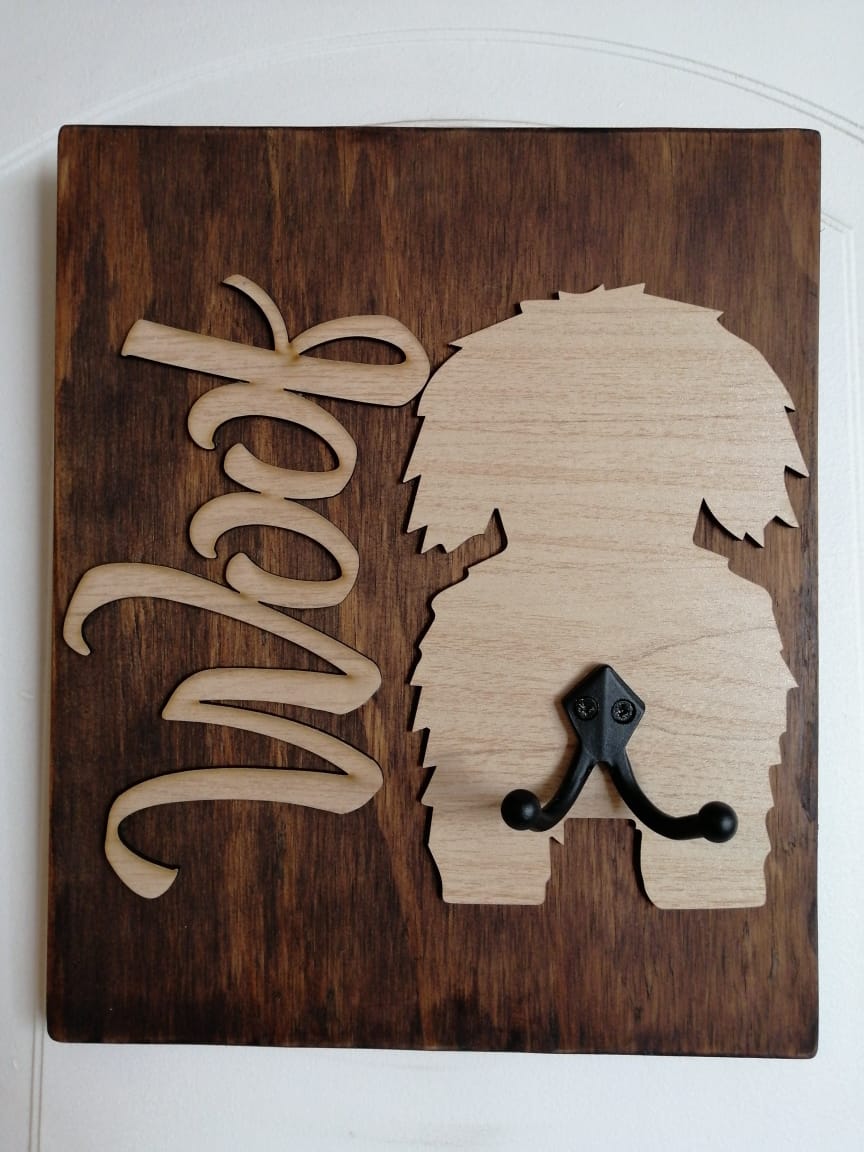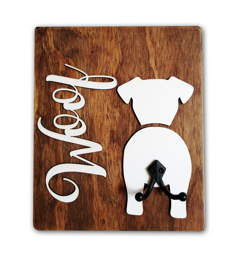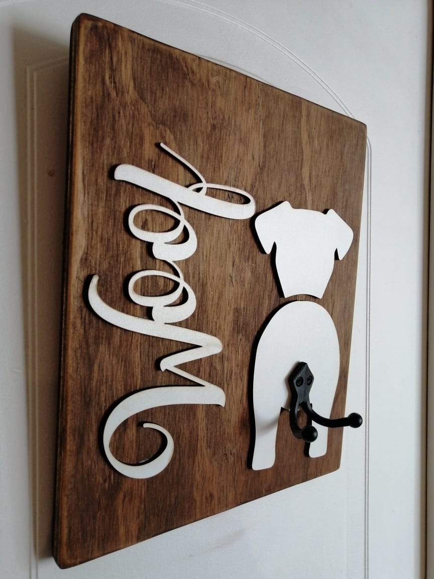 Madera barnizada con silueta de perrito o gato con colgador. Puede colgar las correas, plaquitas, llaveros y cualquier accesorio de tu peludo.